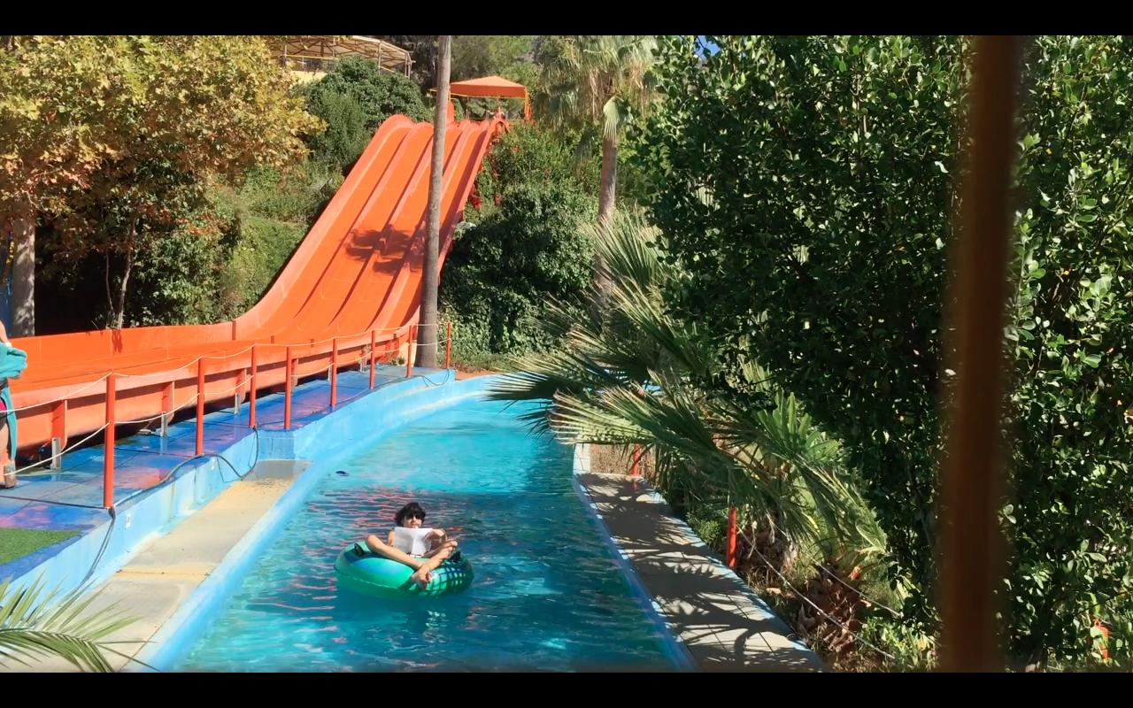 Xenophon Ritsopoulos, Chief Executive Officer of acqua plus Waterpark on the other side of the valley, raves about the liberating energy of the slides. Whoever comes to the water park is ready to leave their worries behind. Exuberance, he assures us, requires an appropriate attitude, which all of his consumers muster. Here, the focus is not on a refined self-relation, but on tangible bio-chemical processes of pleasure, namely vertigo and acceleration. The water for the park is provided by a private well, says Ritsopoulos. In a gigantic sewage plant underneath the park, the used water is purified. At least some of it can thus be returned to the slides or used to irrigate the overflowing flowerbeds and shrubs. Water is only lost through evaporation, says Ritsopoulos.