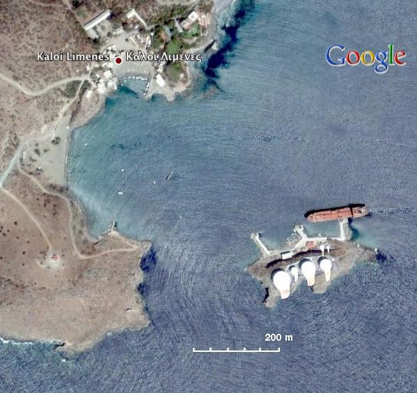 Einzig eine große Infrastruktur-Anlage stört das Auge: Mitten in der Bucht, auf der kleinen Insel Mikronisi, thront eine Schiffstankstelle. In mehreren Silos wird hier Schweröl gelagert, mit dem Containerschiffe, Frachter und andere Boote betankt werden. Die Tankstelle wird von der Firma SEKA geführt. Das Wappen der Firma, dessen doppelte Flügel an Pegasus erinnern, ist auch am kleinen Seemanns-Club angeschlagen. Davor sitzen Arbeiter in der Sonne und rauchen.